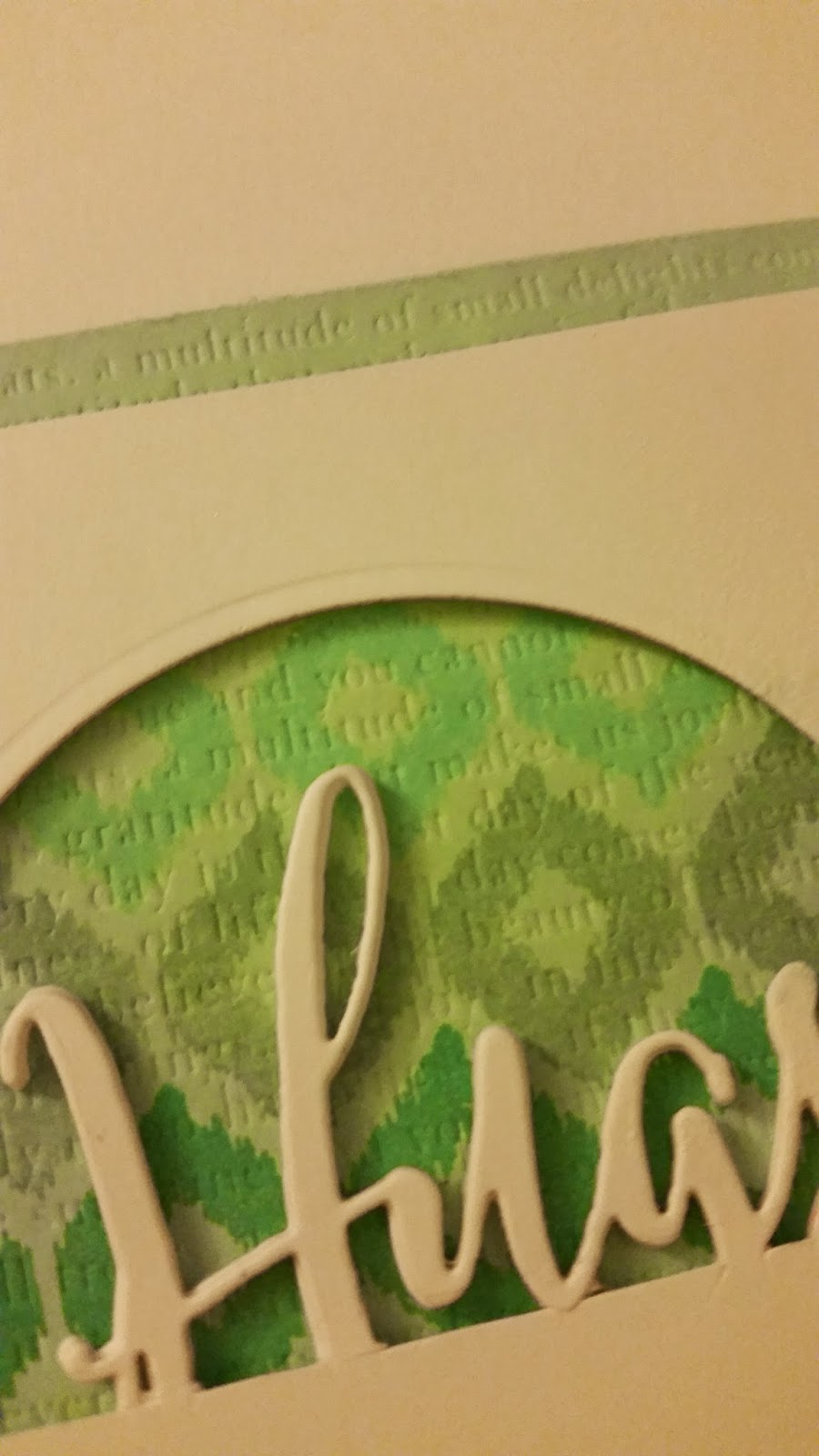 I took a cursive Hugs die and a circle die and did the partial die cutting on a Recollections 110lb white card front. I also die cut four more Hugs die cuts to pop it up and add some dimension combined with foam tape.
